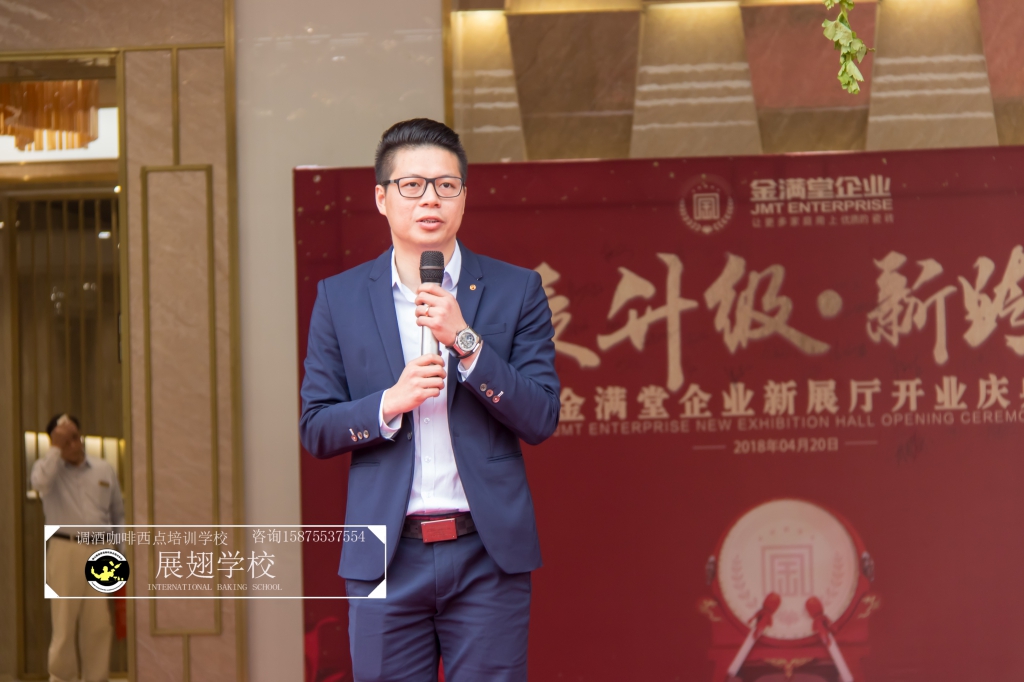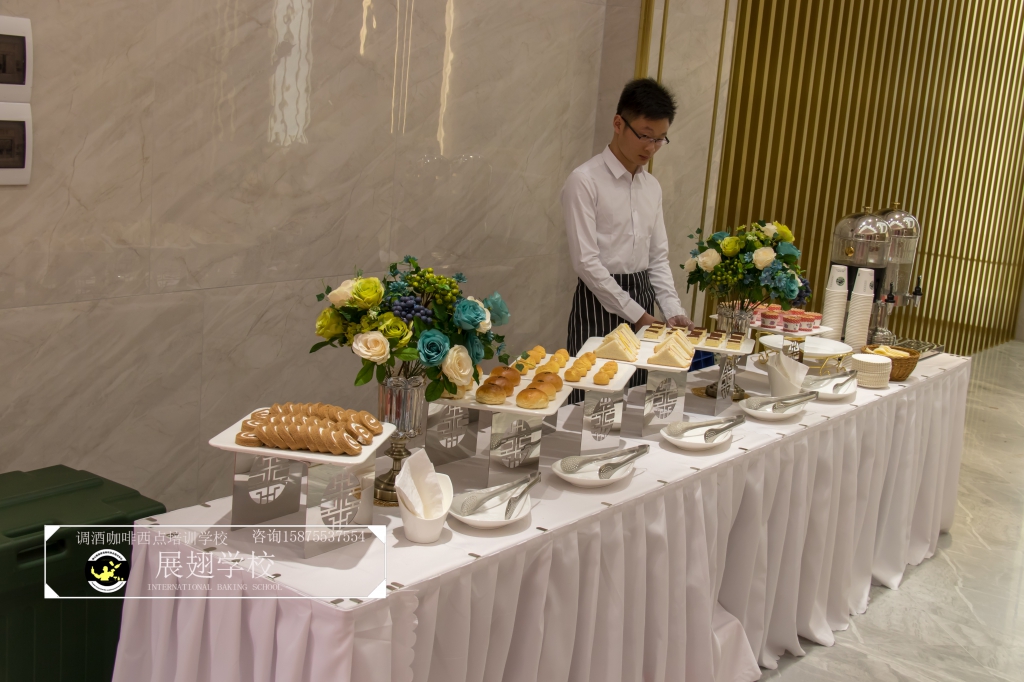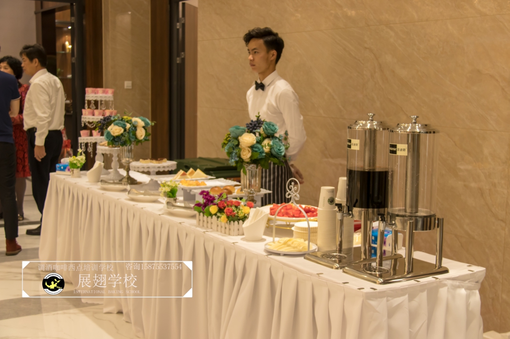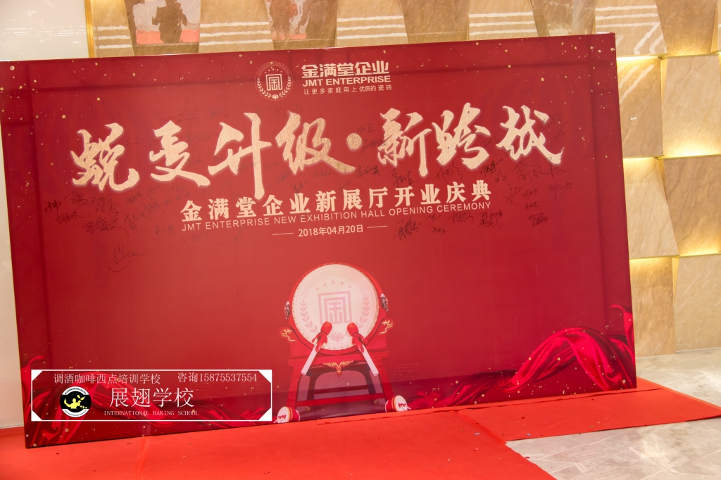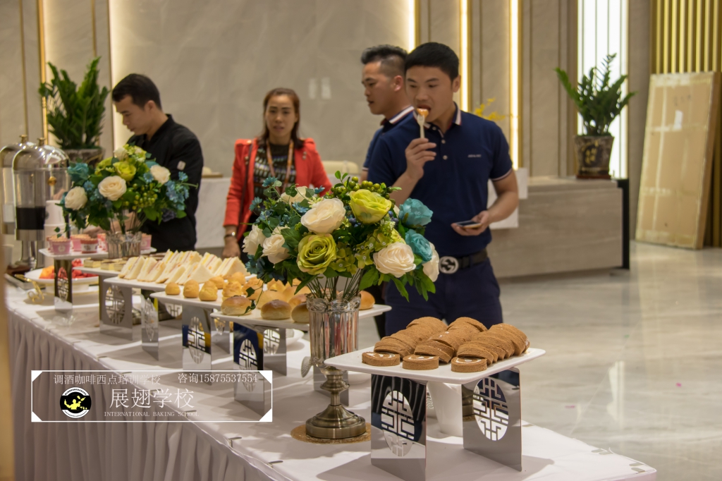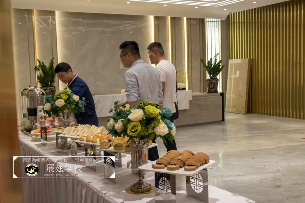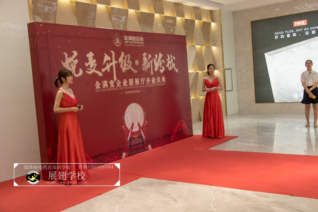 2018年4月20日,金滿堂企業開業典禮,佛山展翅調酒咖啡西點培訓學校的學員們為現場提供了精致美味的西點茶歇供大家享用,此次外出實踐活動,這樣可以檢驗學員這段時間以來的學習成果,還能讓學員親自體驗下西點服務行業的工作,還能提升自己的技術和能力。