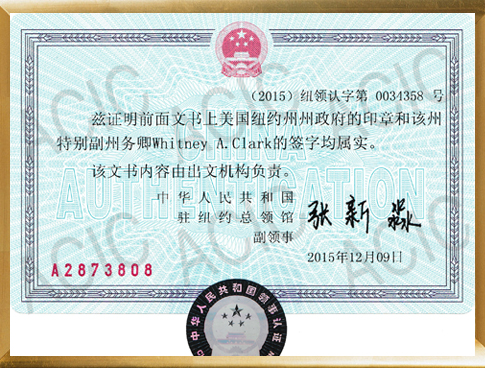 美國科羅拉多州政府頒發的注冊證書(經美國公證處及紐約州務卿公證)